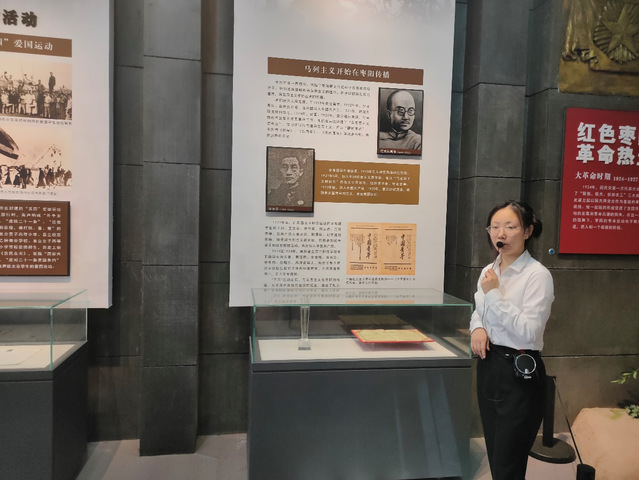 随后在工作人员的带领下,团队走进庄严的烈士革命纪念馆。踏过门槛,迎面的便是革命士兵的立体塑像,其中的人目光坚定,神情肃然,似抱着赴死的决心,不畏艰苦,又似含着对更好中国的希冀,坚定地相信他们的所为能换来和平安宁,他们的摸样正如雕塑上方的字样:“鄂西北革命的曙光”。向左绕,是这鄂西北城市革命历程的伊始,先以大量的图片讲述侵略下枣阳人民的水深火热,青年人觉醒信念,革命的种子就此萌芽。程克绳是枣阳当地家喻户晓的革命英雄,他带领了一批有为青年,将马列主义在枣阳推向全城,看这后辈凭想象为纪念枣阳第一批党小组塑造的一角,其中程克绳紧握右拳,向上举起,做宣誓状,目光炯炯。