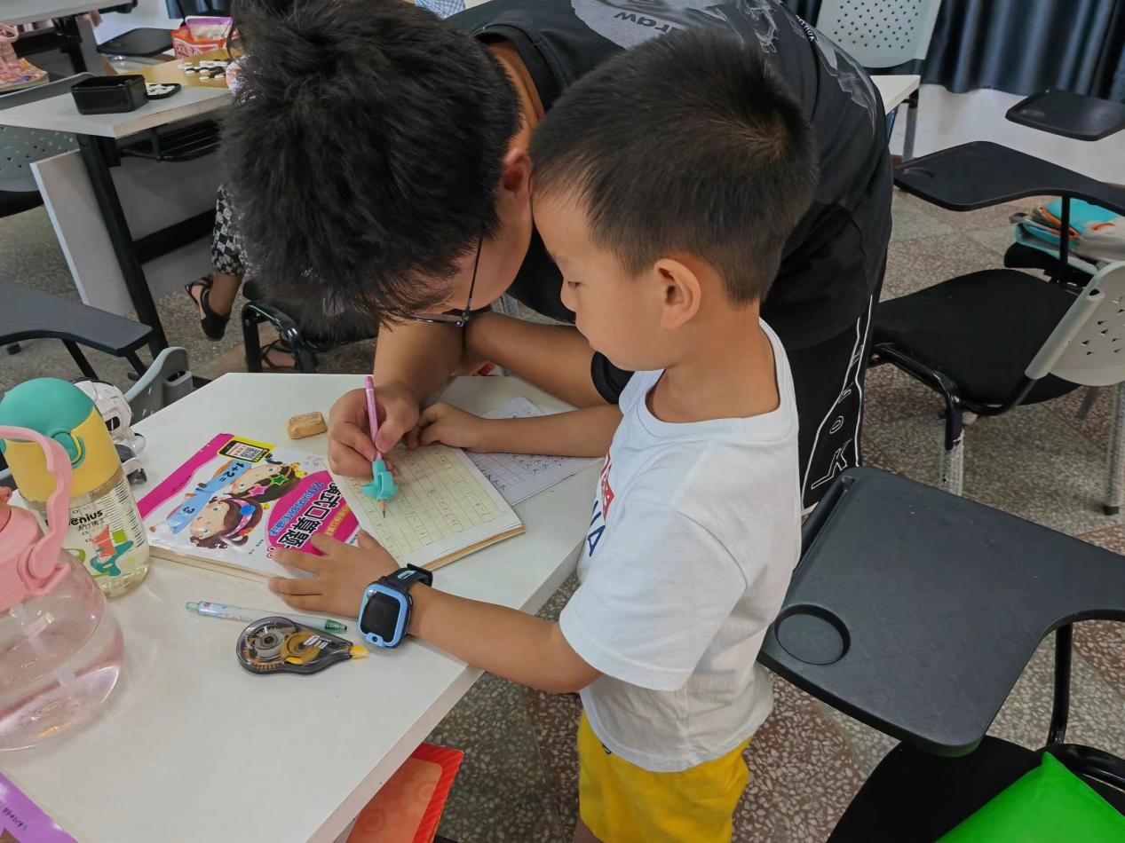 (图为志愿者指导学生写字。通讯员 韩娜 供图)