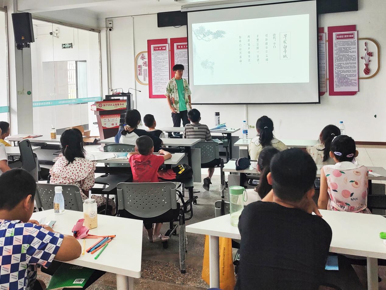 本网讯(通讯员 韩娜)唐诗宋词是我国历史长河中熠熠生辉的中国文化瑰宝,经过了千年的沉淀,为了让学生了解更多古诗词知识感受中国文化的魅力,陶冶情操。7月16日我校北纬30度·寻粹社会实践队第十分队的志愿者来到湖北省鄂州市鄂城区儒学社区以古诗词为中心展开了一次授课。现代社会的飞速发展,许多事物正在不断地遭到抛弃。对物质的狂热追求、使人的心灵俞来俞孤独。面对今天的生活,人成为一台开足马力的机器。在复杂的人情世故中不停旋转。对于学生们来说,日常繁重的学业常常使他们疲惫不堪。心情烦躁。通过本次课程的学习不仅使学生与诗词同行,也体会了古诗词中的才情和道理,陶冶了情操,沉淀才学,做更好的自己。这也促使中国传统文化得到了继承和发展,继续发扬光大,成为中国人民丰富的精神财富。