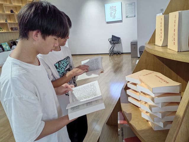 (图为实践队员们阅读展示中心摆放的书籍。通讯员袁冰雪 供图)