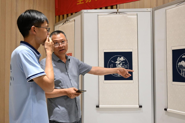 (图为张老师为实践队员讲解廉洁主题的雕花剪纸)