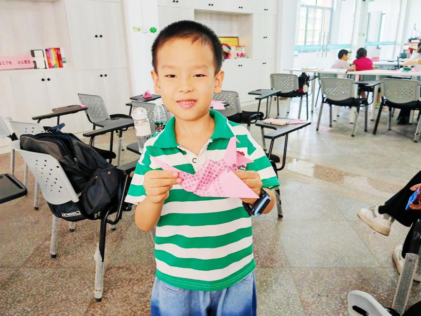 (图为这个六岁的小朋友通过不断努力,独立完成了人生中的第一只千纸鹤,他露出了可爱的笑容。通讯员 韩娜 供图)