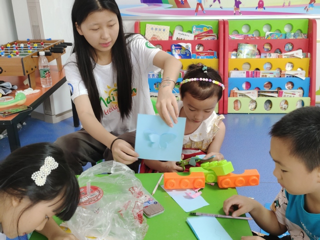 (图为学生们在团队成员单领之下做手工,课堂其乐融融)