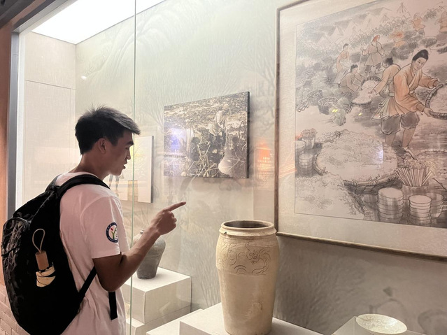 (图为志愿者们参观纪念馆内陈设和文物内容)