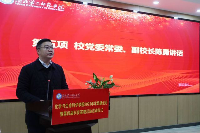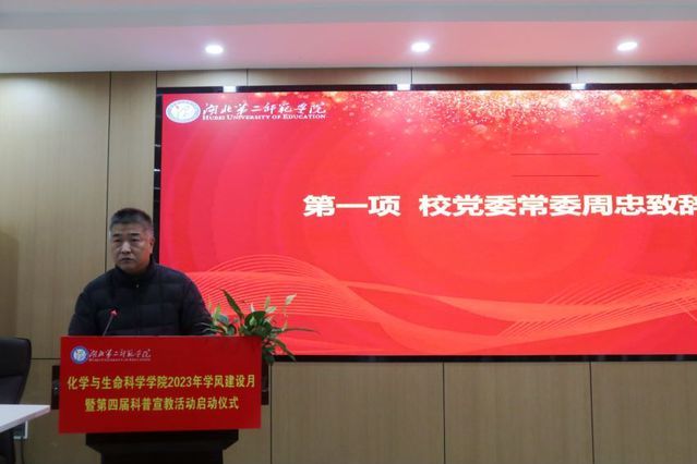 本网讯 (青媒见习记者 彭盼 汪妍)11月30号下午,我校化学与生命科学学院(以下简称“化生院”)2023年学风建设月暨第四届科普宣教活动启动仪式于S6201顺利举行。校党委常委、副校长陈勇,校党委常委、宣传部部长周忠出席。化生院党委副书记雷晓林主持本次会议。
