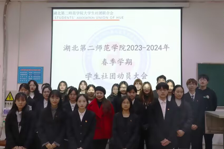 校社联主席刘东杰进行本学期工作计划汇报,副主席曹倩宣读《关于湖北第二师范学院2023-2024学年春季学期学生社团开始工作的通知》。