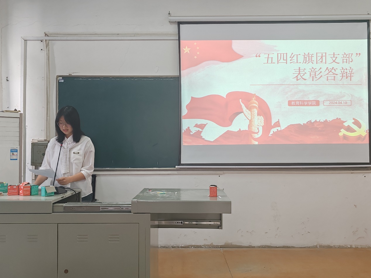本网讯(通讯员 程婷)为充分发挥“五四红旗团支部”的引领示范作用,激励各级团组织和广大团员、团干部锐意进取、创先争优,鼓励各级团组织和广大团员青年继承“五四”光荣传统,4月10日,教育科学学院(以下简称“教科院”)于5205教室召开“五四红旗团支部”表彰答辩大会,教科院分团委副书记唐志强出席本次活动,21级、22级团支书和团员参加本次活动,23级教育学类2班秦雨馨担任主持人。