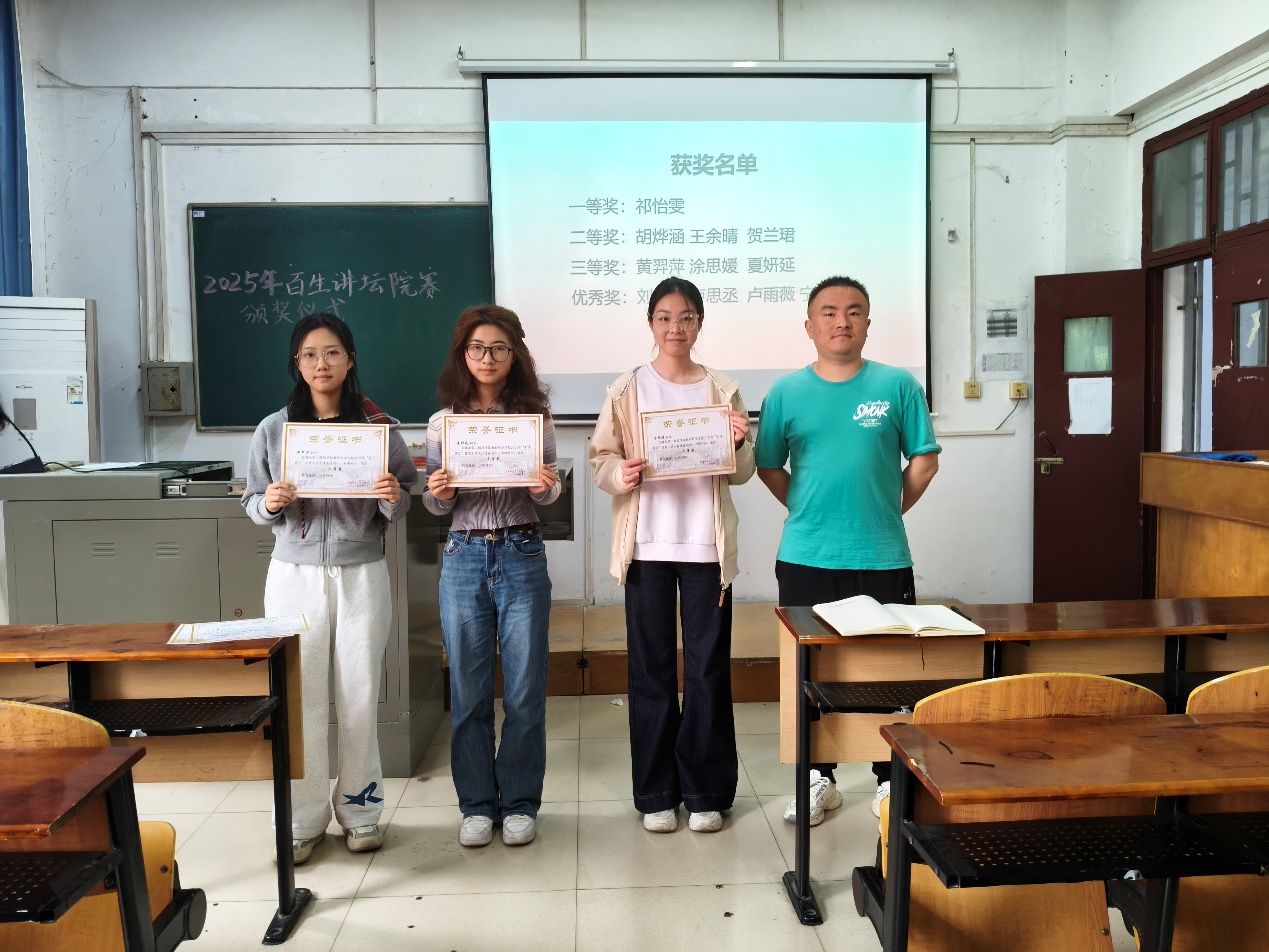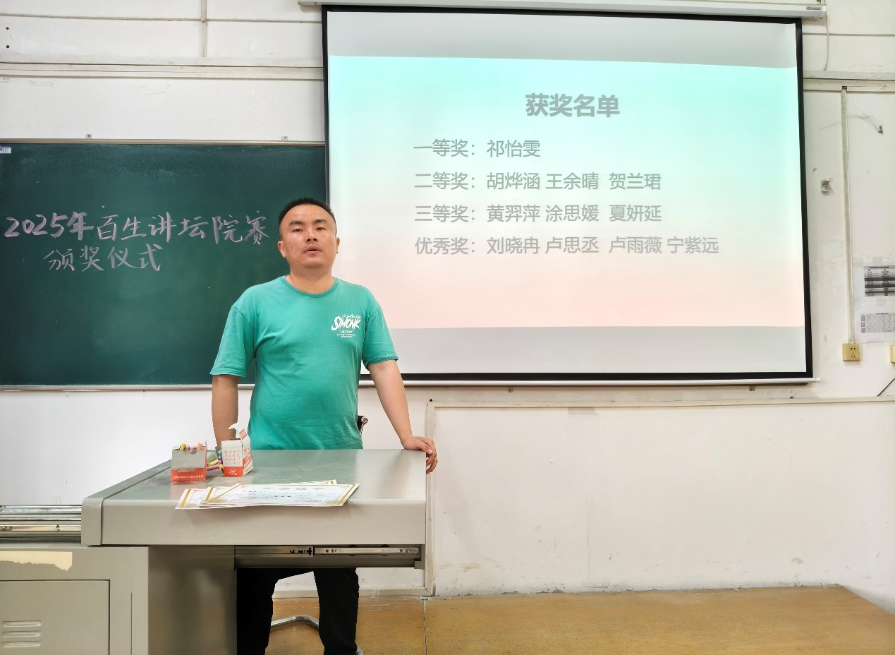 本网讯(通讯员 李金珍)为进一步推动 “百生讲坛” 活动开展,激发学生参与热情,4月11日午11时50分,我校教育科学学院(以下简称“教科院“)于5207开展“百生讲坛”优秀主讲人颁奖仪式。教科院分团委副书记唐志强及全体参赛选手参与此次颁奖仪式,24级小学教育3班王高若担任主持人。