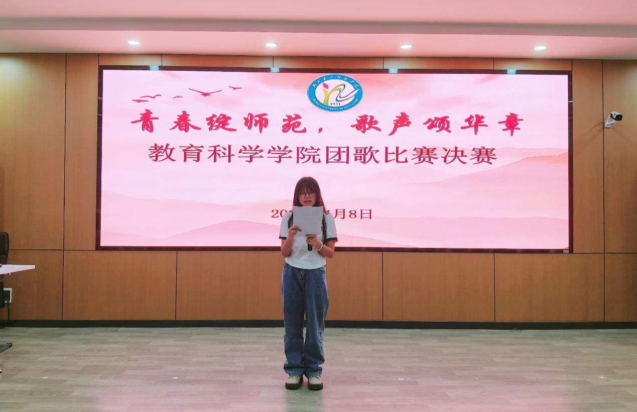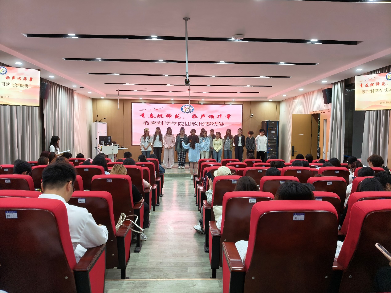 本网讯(通讯员 李金珍)为弘扬正能量,展示青春风采,4月8日晚18时,我校教育科学学院(以下简称“教科院”)于S6201举行团歌赛决赛,教科院分团委副书记唐志强,学生第二党支部书记杨霞,辅导员关畅、龚敏、任淑叶、郭希及青春音乐社主要干部担任评委, 24级小学教育1班杨婷婷担任主持人。