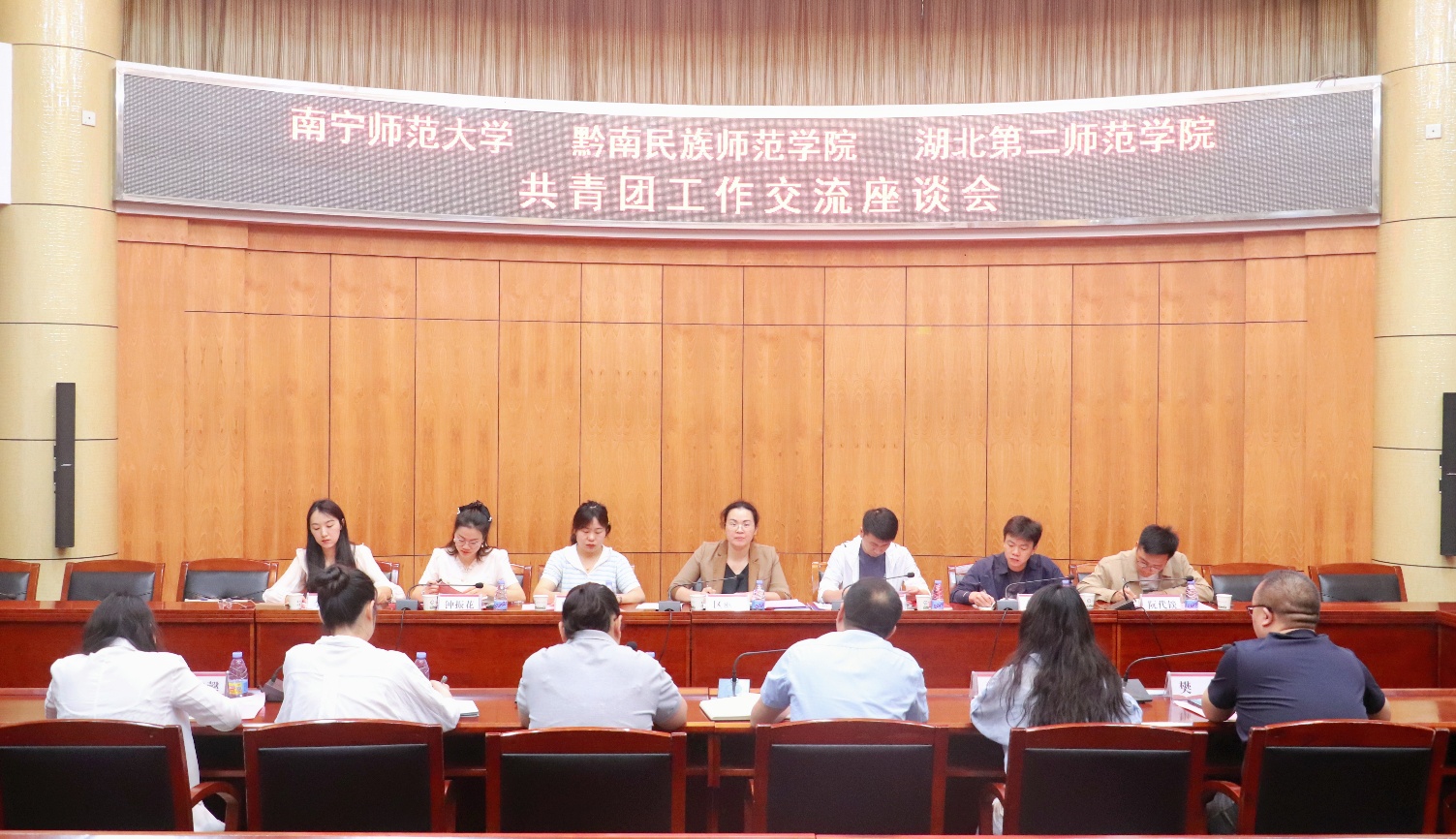 本网讯(青媒见习记者 周静怡)5月7日上午,南宁师范大学团委书记区丽媛,黔南民族师范学院团委书记苏锐一行来校交流,双方在行政楼一号会议室举行座谈会,校团委书记刘锐主持会议。