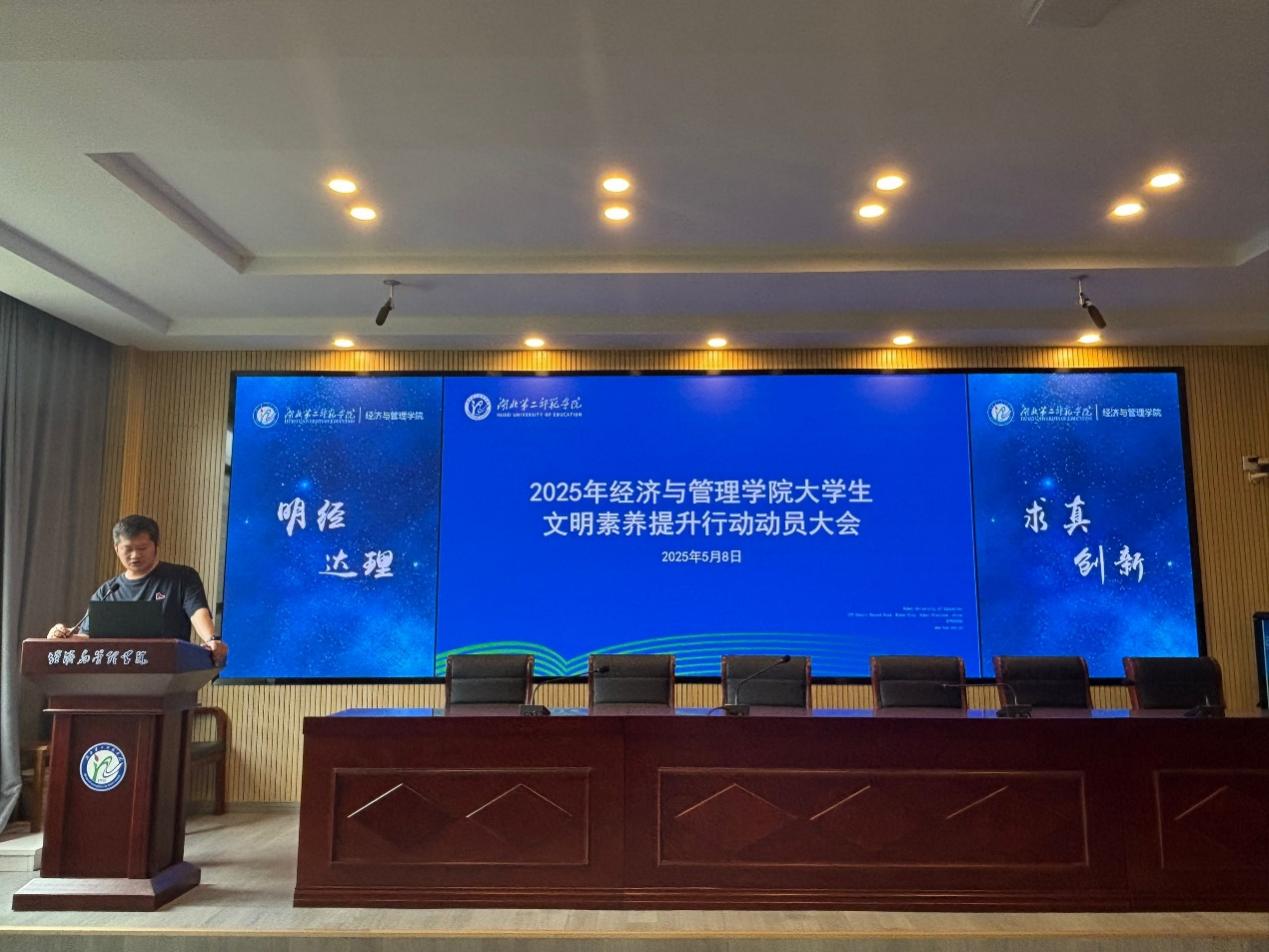 本网讯(通讯员 张泉)为深入实施“时代新人铸魂工程”,着力教育引导学生积极践行社会主义核心价值观,强化学生科学精神与人文底蕴,构建平安和谐校园,5月8日中午,经济与管理学院在2号楼3楼多功能报告厅开展2025年大学生文明素养提升行动动员大会,经济与管理学院学生工作办公室主任周慧东、全体辅导员出席会议,经济与管理学院全体心理委员、寝室长参加会议。会议由周慧东主持。
